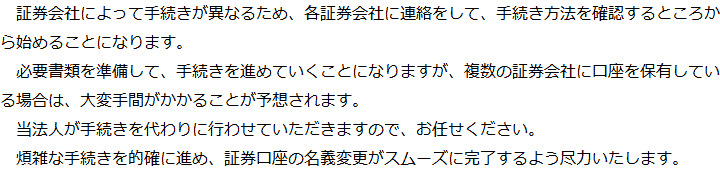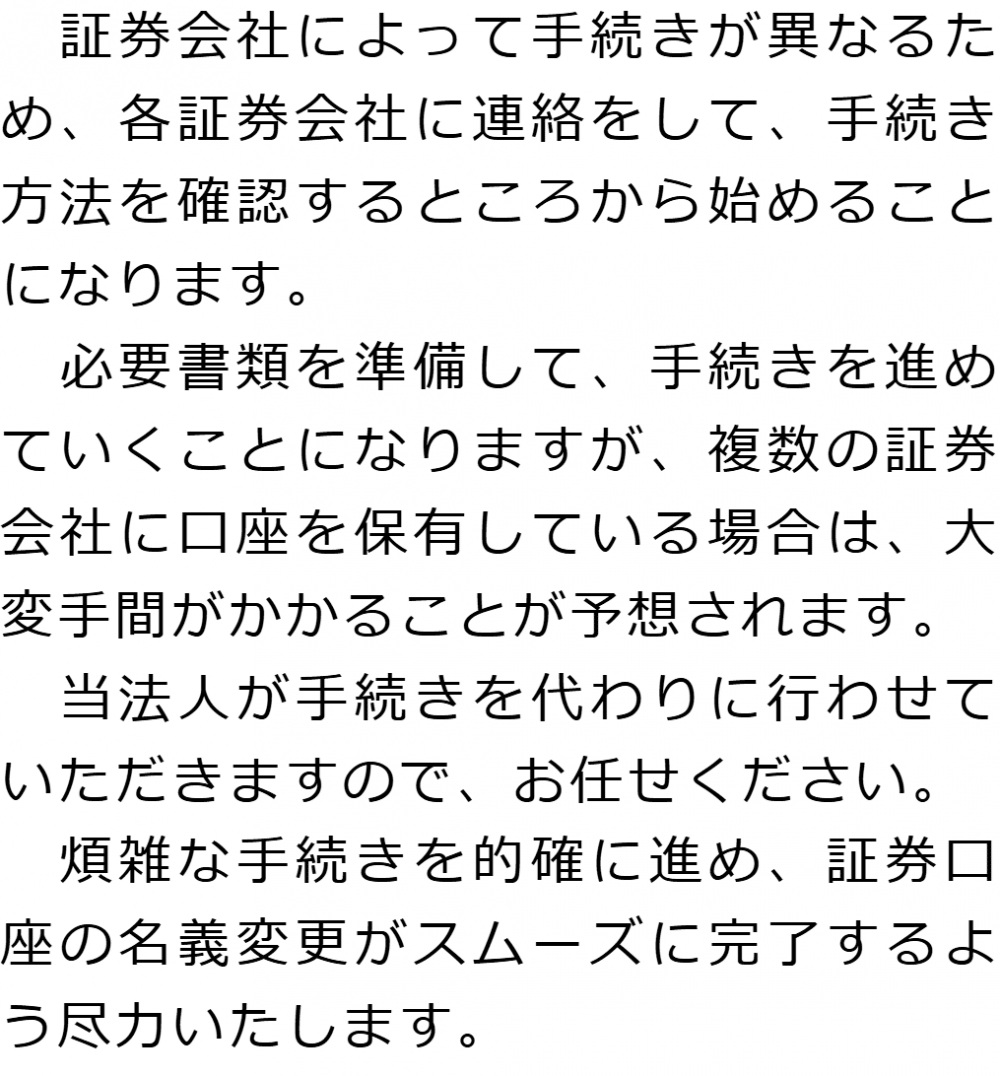 証券口座を相続した場合、口座の解約・名義変更が必要となります。