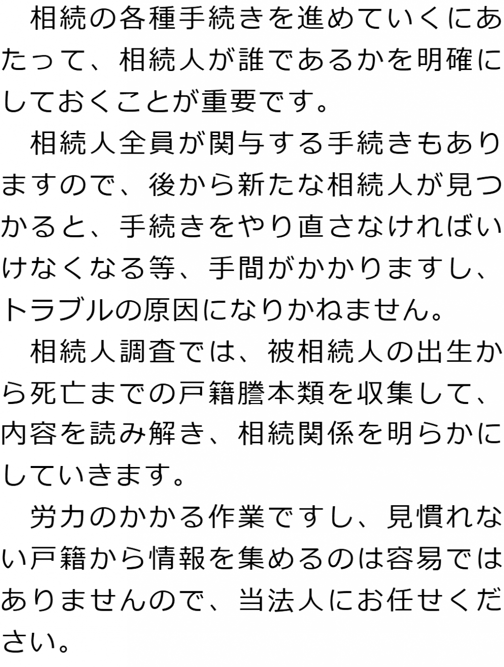 トップ業務内容相続人調査 階層構造▼ 業務内容(目次) 相続人調査 業務内容(目次)業務内容トップ行政書士法人心の業務内容遺言遺産整理相続人調査相続財産調査遺産分割協議書の作成預金・貯金の解約・名義変更証券口座の解約・名義変更自動車の名義変更心グループのその他の業務内容家族信託・民事信託節税対策事業承継遺言の検認相続放棄限定承認遺産分割遺留分侵害額請求相続登記相続税申告相続税調査 受付時間 平日 9時~21時、土日祝 9時~18時 夜間・土日祝の相談も対応します (要予約) 所在地 〒277-0005 千葉県柏市柏4-2-1メットライフ柏ビル3F(旧表記:リーフスクエア柏ビル3F) 0120-2403-39 お問合せ・アクセス・地図