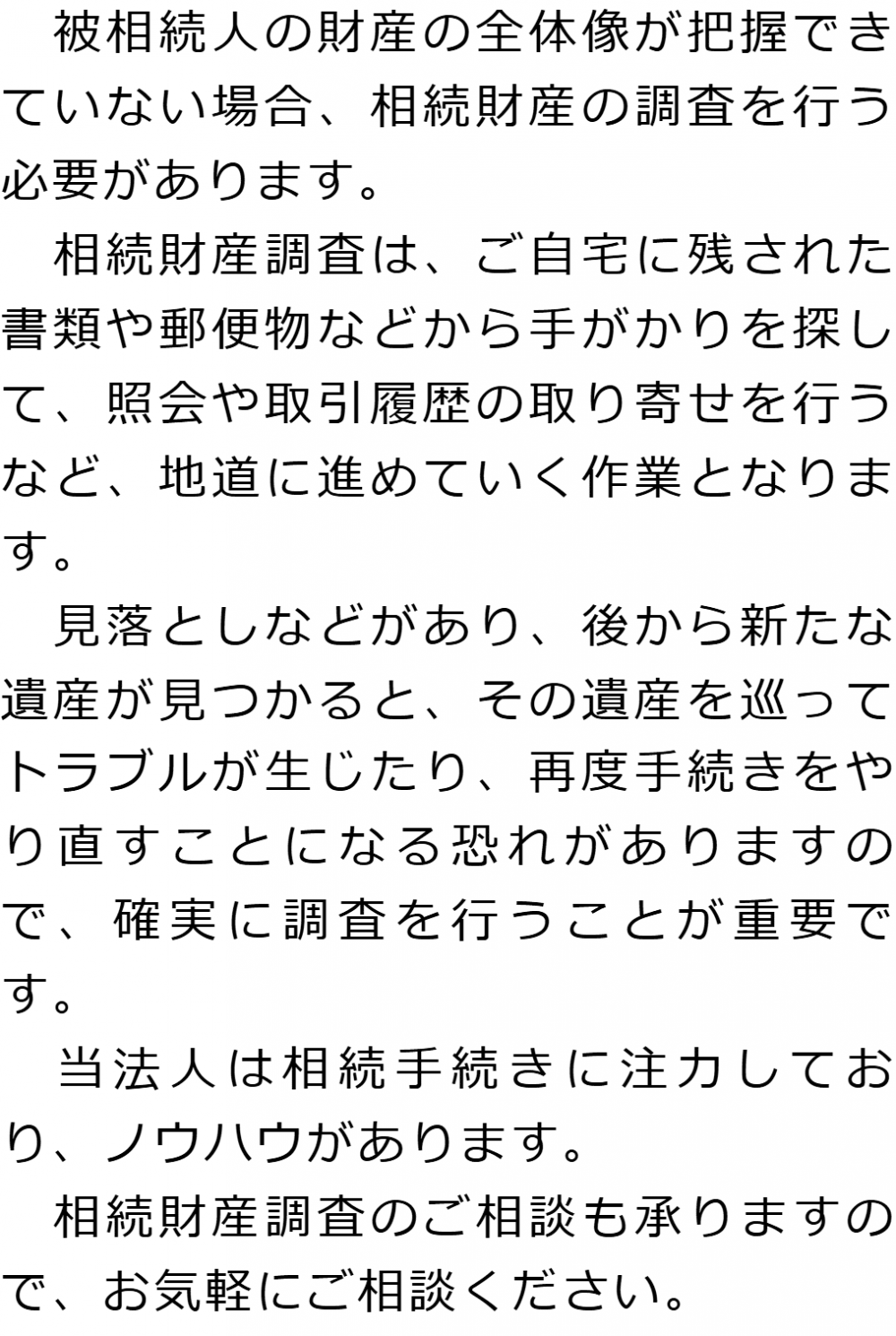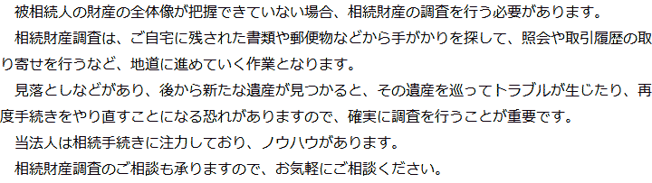 トップ業務内容相続財産調査 階層構造▼ 業務内容(目次) 相続財産調査 業務内容(目次)業務内容トップ行政書士法人心の業務内容遺言遺産整理相続人調査相続財産調査遺産分割協議書の作成預金・貯金の解約・名義変更証券口座の解約・名義変更自動車の名義変更心グループのその他の業務内容家族信託・民事信託節税対策事業承継遺言の検認相続放棄限定承認遺産分割遺留分侵害額請求相続登記相続税申告相続税調査 受付時間 平日 9時~21時、土日祝 9時~18時 夜間・土日祝の相談も対応します (要予約) 所在地 〒277-0005 千葉県柏市柏4-2-1メットライフ柏ビル3F(旧表記:リーフスクエア柏ビル3F) 0120-2403-39 お問合せ・アクセス・地図