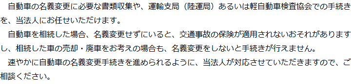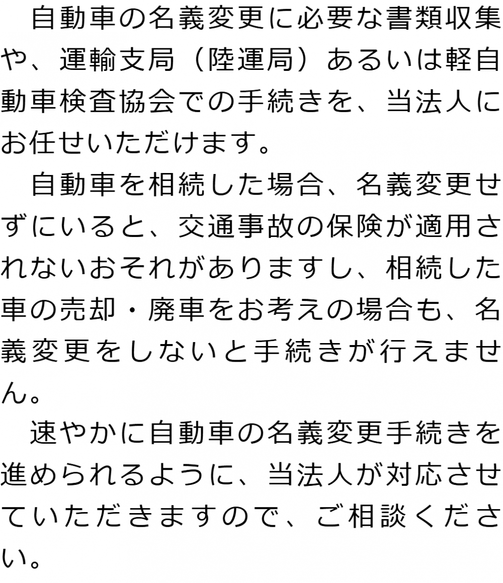 トップ業務内容自動車の名義変更 階層構造▼ 業務内容(目次) 自動車の名義変更 業務内容(目次)業務内容トップ行政書士法人心の業務内容遺言遺産整理相続人調査相続財産調査遺産分割協議書の作成預金・貯金の解約・名義変更証券口座の解約・名義変更自動車の名義変更心グループのその他の業務内容家族信託・民事信託節税対策事業承継遺言の検認相続放棄限定承認遺産分割遺留分侵害額請求相続登記相続税申告相続税調査 受付時間 平日 9時~21時、土日祝 9時~18時 夜間・土日祝の相談も対応します (要予約) 所在地 〒277-0005 千葉県柏市柏4-2-1メットライフ柏ビル3F(旧表記:リーフスクエア柏ビル3F) 0120-2403-39 お問合せ・アクセス・地図