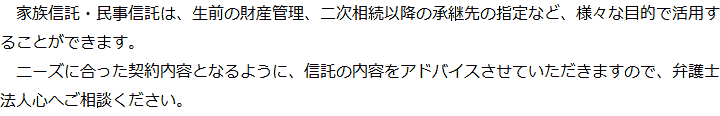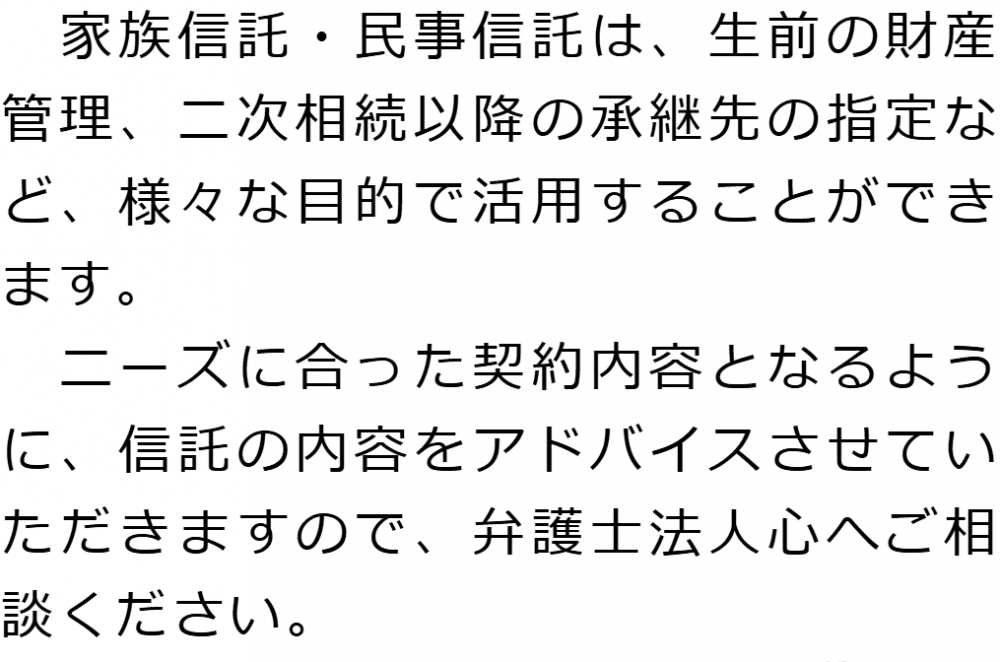 トップ業務内容家族信託・民事信託 階層構造▼ 業務内容(目次) 家族信託・民事信託 業務内容(目次)業務内容トップ行政書士法人心の業務内容遺言遺産整理相続人調査相続財産調査遺産分割協議書の作成預金・貯金の解約・名義変更証券口座の解約・名義変更自動車の名義変更心グループのその他の業務内容家族信託・民事信託節税対策事業承継遺言の検認相続放棄限定承認遺産分割遺留分侵害額請求相続登記相続税申告相続税調査 受付時間 平日 9時~21時、土日祝 9時~18時 夜間・土日祝の相談も対応します (要予約) 所在地 〒277-0005 千葉県柏市柏4-2-1メットライフ柏ビル3F(旧表記:リーフスクエア柏ビル3F) 0120-2403-39 お問合せ・アクセス・地図