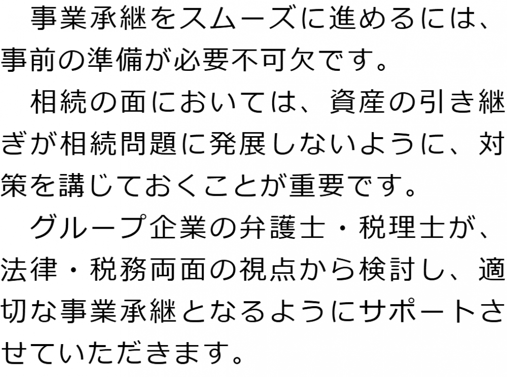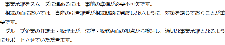 トップ業務内容事業承継 階層構造▼ 業務内容(目次) 事業承継 業務内容(目次)業務内容トップ行政書士法人心の業務内容遺言遺産整理相続人調査相続財産調査遺産分割協議書の作成預金・貯金の解約・名義変更証券口座の解約・名義変更自動車の名義変更心グループのその他の業務内容家族信託・民事信託節税対策事業承継遺言の検認相続放棄限定承認遺産分割遺留分侵害額請求相続登記相続税申告相続税調査 受付時間 平日 9時~21時、土日祝 9時~18時 夜間・土日祝の相談も対応します (要予約) 所在地 〒277-0005 千葉県柏市柏4-2-1メットライフ柏ビル3F(旧表記:リーフスクエア柏ビル3F) 0120-2403-39 お問合せ・アクセス・地図